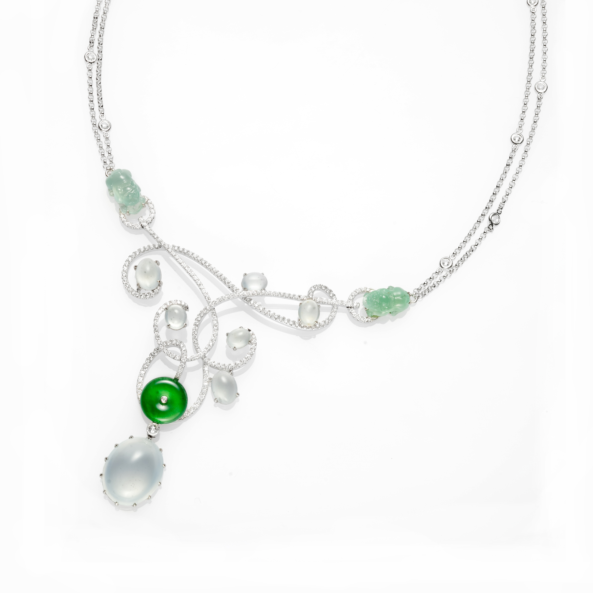 明淨的白色翡翠,玉質澄澈瑩潤,翠色清透似雪,一如每個人內心的初衷,甦醒深處這份純粹的美麗。將東方白翡珠寶結合西方設計工藝,無論簡約、華麗或秀雅,可以於盛宴之中耀出光采,也可以於日常之間展現柔美;妝點以鑽石襯托出璀璨而內斂、純粹而獨特、溫潤而堅強的姿態,演繹翡翠深層本質的那份柔韌力量,亦流露嫁娶雙方成為一家人的親密祝福與恰到好處的心意。