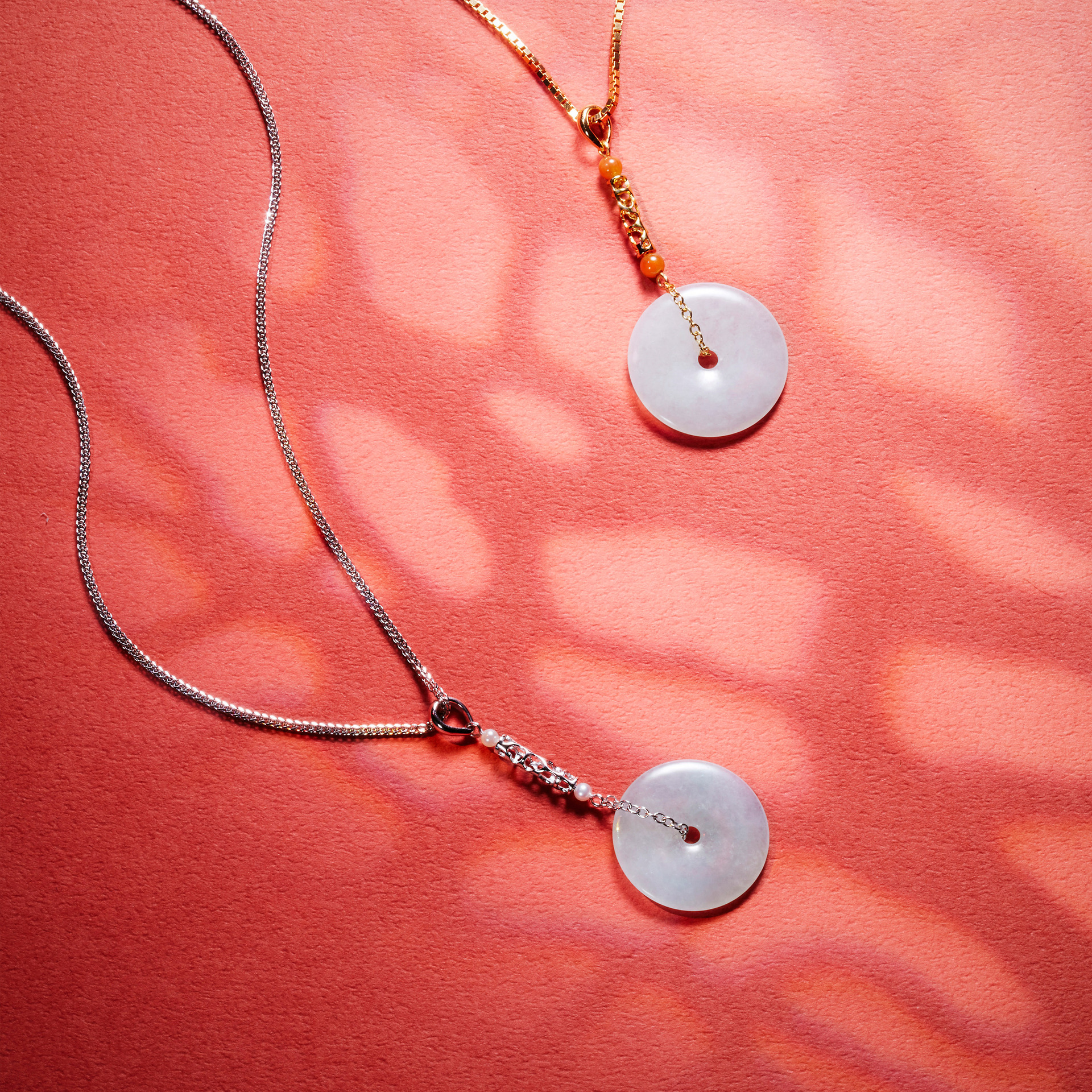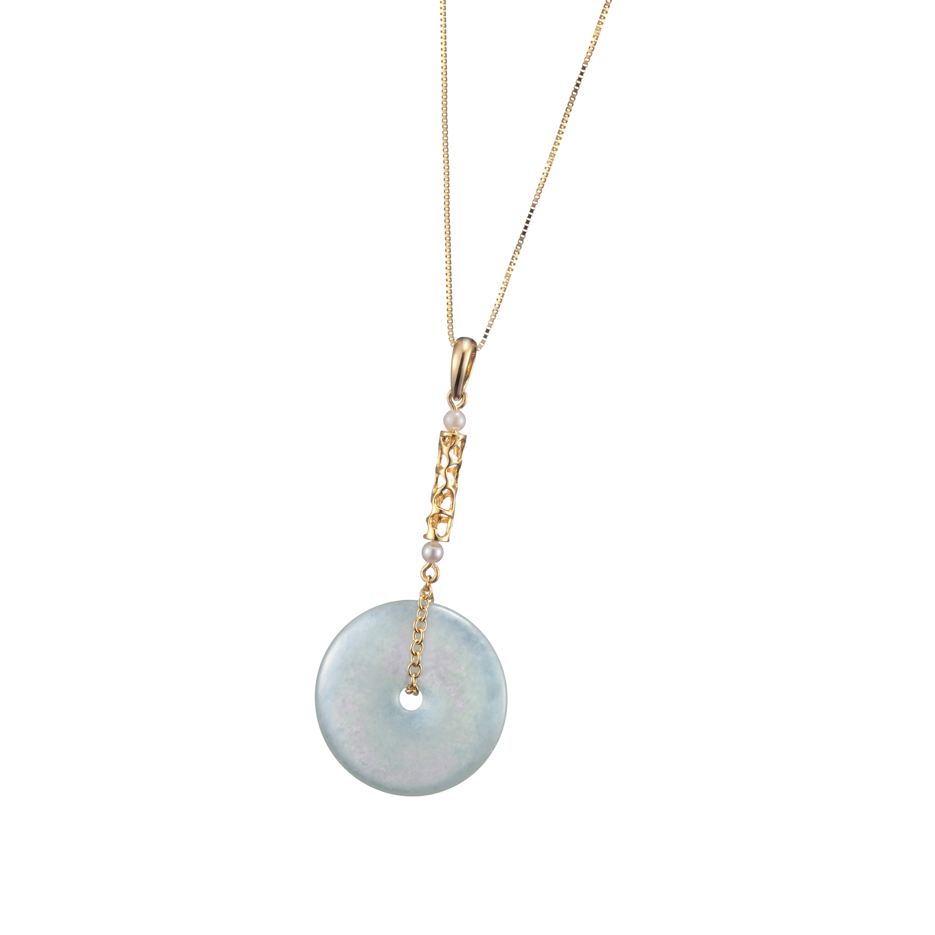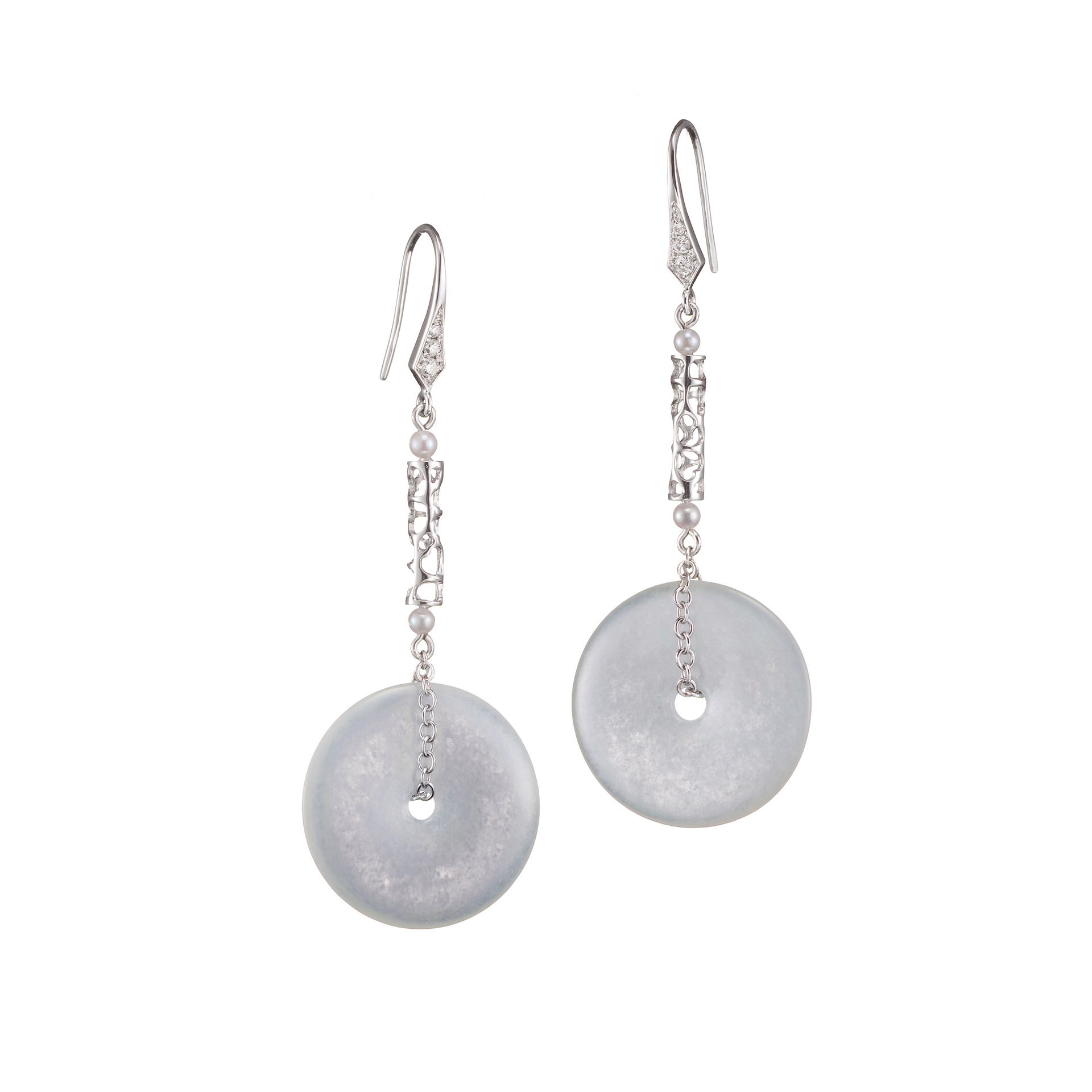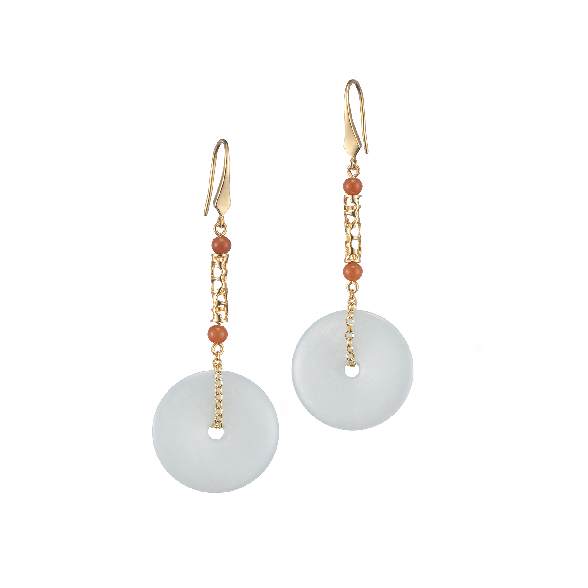 「鏤空」一直是珠寶飾品的設計重點之一,可謂經典而歷久彌新的款式,不僅創造出輕盈感,也展現金工的專業實力。【華燈映】系列,以經典的古錢造型為主體,翡翠玉質潤澤,翠色清雅舒朗,巧製為耳環與墜飾的珠寶新品。