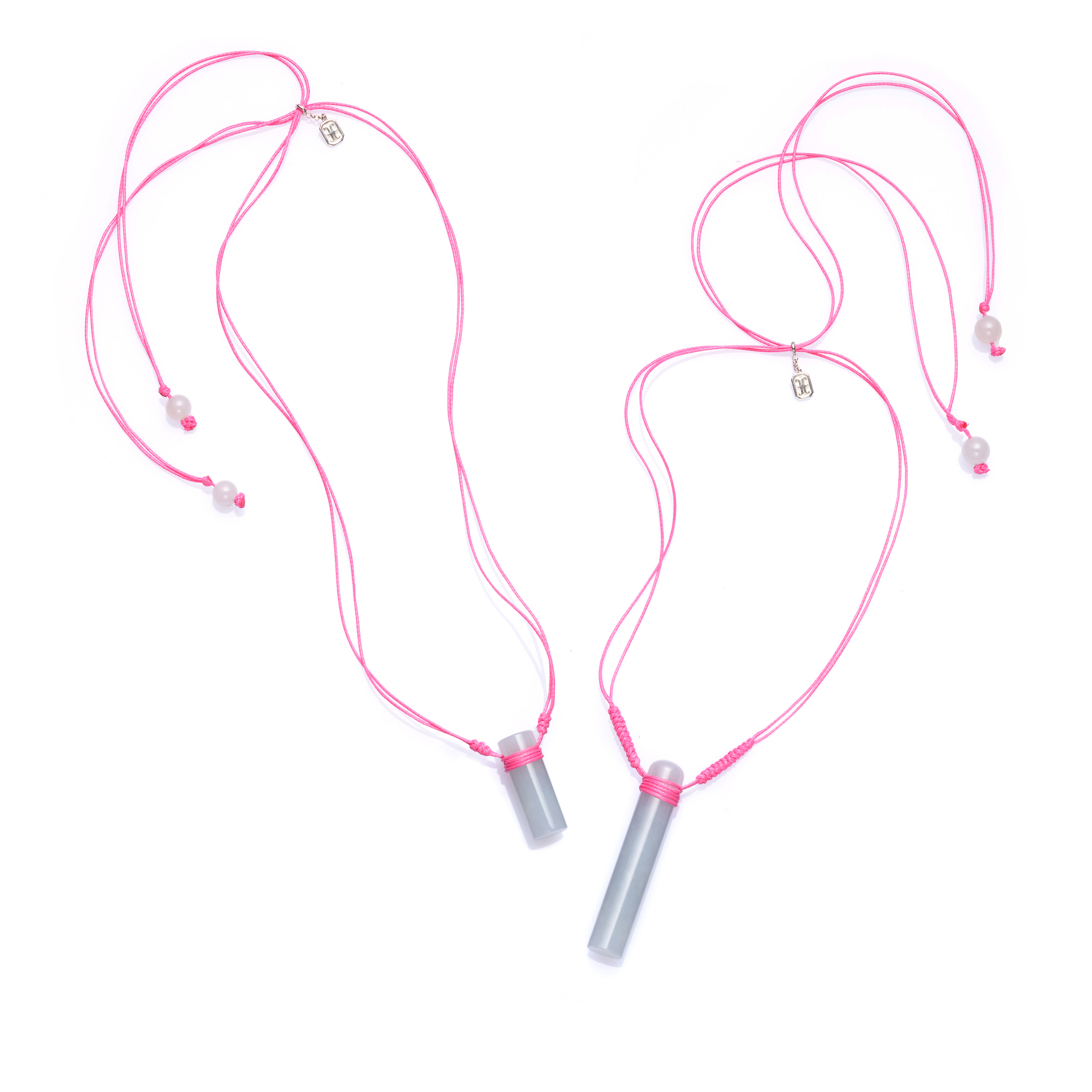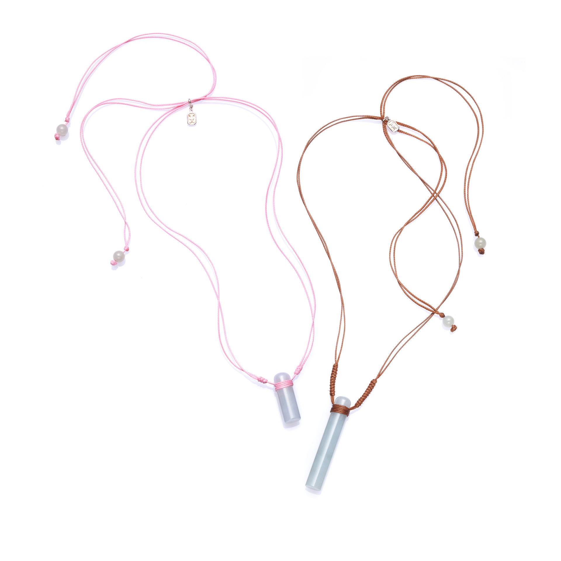 翡翠的本性,既溫柔,又堅韌,是世間最有情感溫度的大地禮物,玉世家將給情人的祝福化作【心心相印】系列,揀選翡翠琢為玉印,質地溫和清潤,色澤雅致恬淡,尤顯東方韻致,印身有長有短,印首切割或剛或柔。此外,整件作品最吸睛之處莫過於大膽的色彩運用,將玉印搭配了包括嬰兒粉、櫻花桃、晴空藍、大地棕等四款年輕亮眼、質感細緻的進口蠟線,以新穎的中國結手法編織鍊身,並在尾端點綴翡翠圓珠、LOGO銀片等裝飾,增添美感層次與視覺趣味;配戴起來簡約、俐落,流露時下年輕人的文青個性氣息,跳脫以往中國結給人的傳統印象。而這款迷你印章除了是風格獨具的時尚配件,也可以鐫字於印面,刻劃情侶之間專屬的一個英文字母,讓兩顆相許的心更添濃情蜜意。