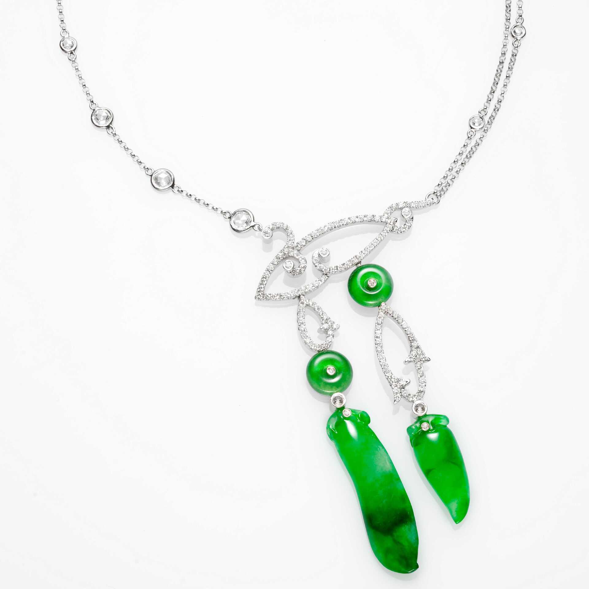 玉世家2017年開春挑選出一系列「魚」形設計的翡翠珠寶,命名為【年年有魚】系列,運用白翡、紅翡、綠翠等翡翠玉材,含括了套鍊、墜飾、胸針、耳環、手鍊、袖扣等各種珠寶款式,視覺風格或輕靈,或熱情,或端莊,或嫻靜,或俐落。其中像是【翡翠鑲鑽魚形套鍊】,闡述「成雙成對」的主題,儷影和諧,青碧盈潤,在古典的設計裡增添悠游的躍動感;另一只【紅翡與蛋面冰種白翡鑲鑽兩用胸針】,乍看之下是豔麗多彩的花朵,看得更深些,那一瓣瓣的紅翡竟是五隻姿態靈動的游水魚兒,搭配翡翠珠與珍珠串起的可拆式流蘇穗子,以異材質相互搭配,既瑰麗燦爛,又饒富喜瑞福氣。