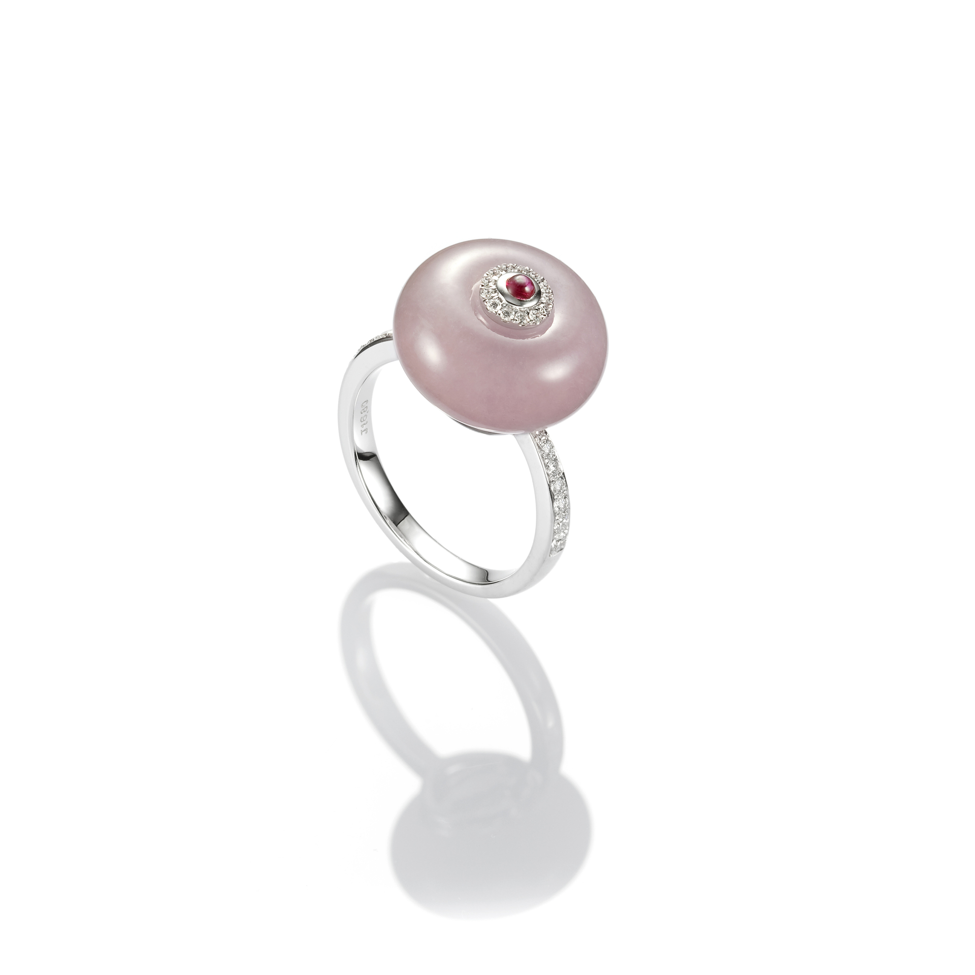 JADEGIA玉世家推出2018春節新品--【滿園春】系列,以飽滿的圓,寓示一元復始。運用細緻優雅的白K金線戒,搭配紫羅蘭翡翠圓形主石,大氣典雅的設計風格加上紅寶石和璀璨鑽石,詮釋出此款雍容華貴的珠寶系列,具體傳述了圓滿、嶄新與富貴的祝福意涵。【滿園春】系列,包含兩款紫羅蘭翡翠戒指,為搭配紅寶石的典雅款,以及搭配紅寶石與鑽石的華貴款。