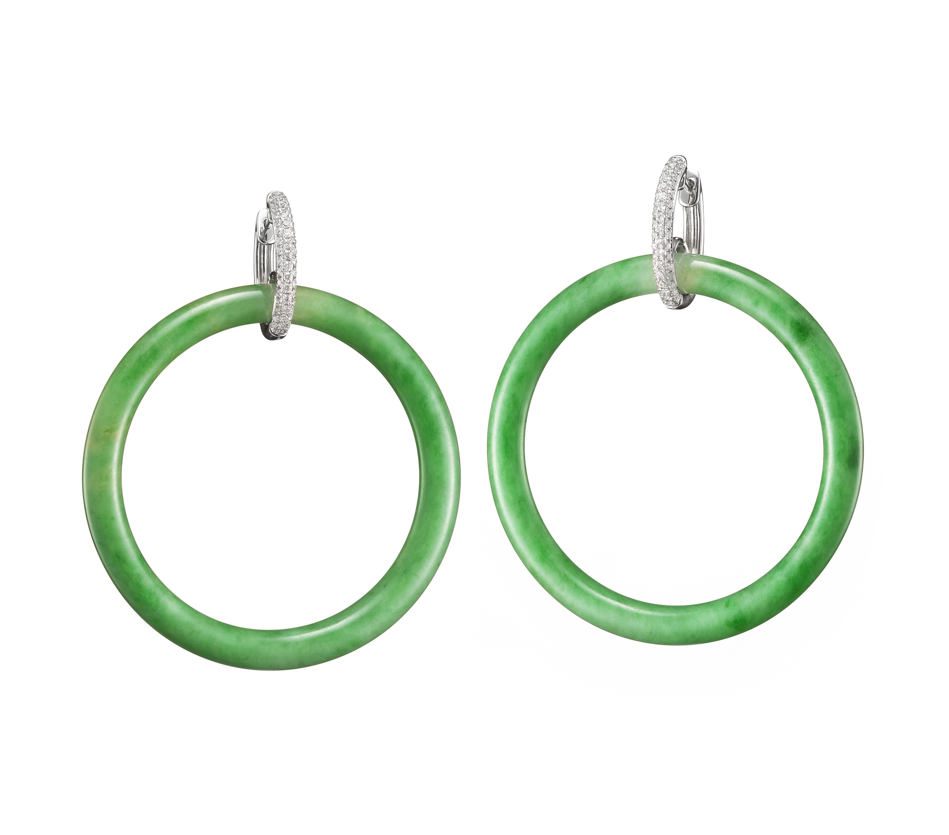 設計師以傳統圓滿意念為基礎,將璧、環與古錢的造型融入於珠寶設計,運用不同的翡翠色澤、異材質珠寶的搭配,琢磨為深具古典韻致的戒指與耳環。另有一款環形交串的玉兔耳墜,將傳統主題做了輕盈的演繹,並結合月中玉兔的形象,展現出俏麗可愛的氣質。