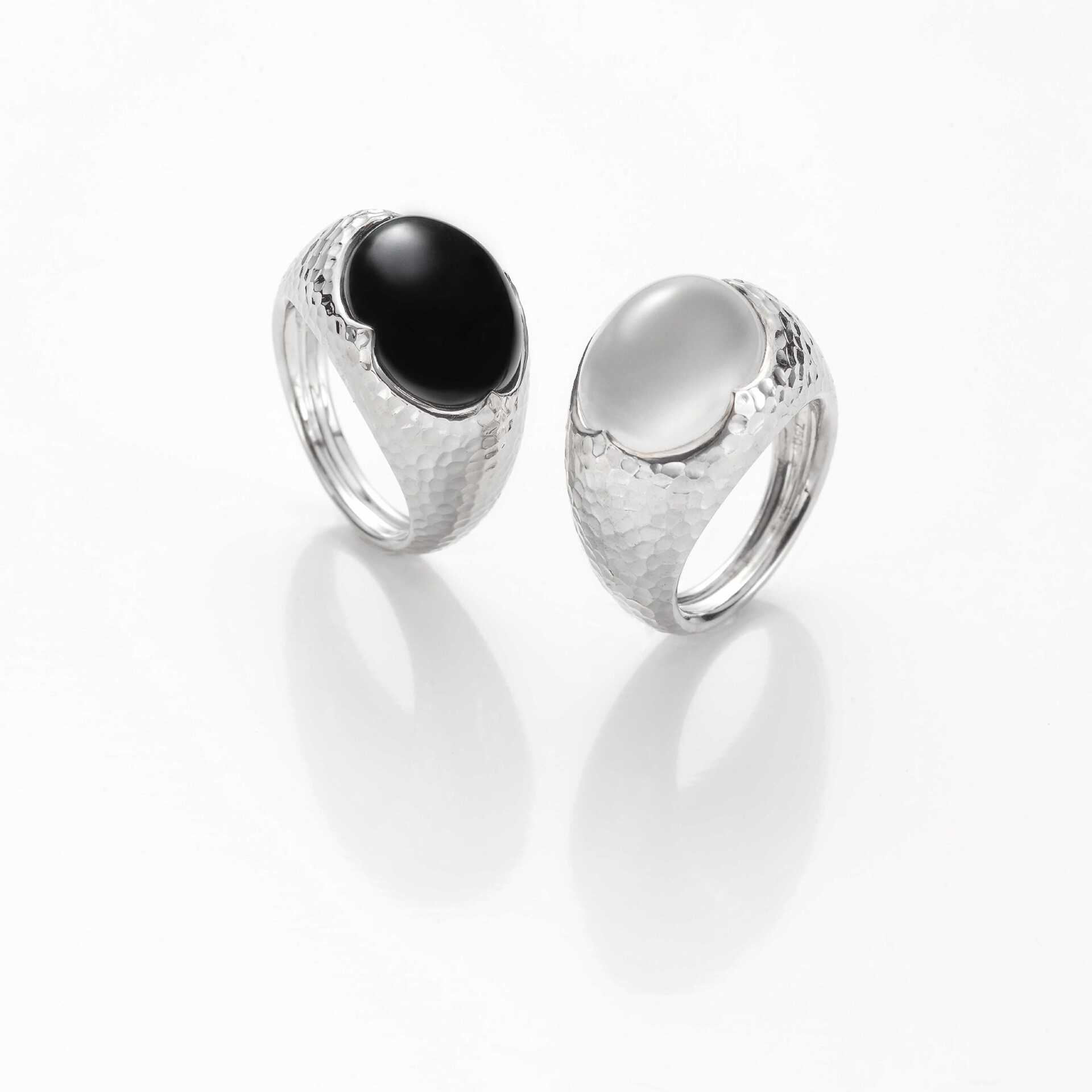 黑與白的對舞,舞一場初遇的似曾相識;理性與感性的共偕,偕一生同行的永恆美好。翡翠玉質,冰透溫潤,渺遠滿眸,戒身凹紋,純由手工敲琢而成,卓然精緻。談笑優雅間,有時尚的美學俐落;沉思凝練裡,更有邃深的智慧光芒。