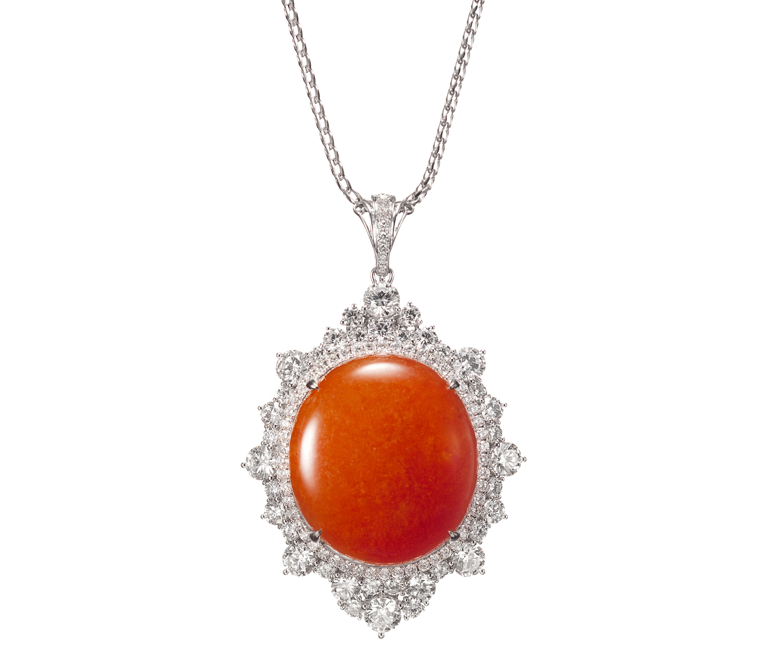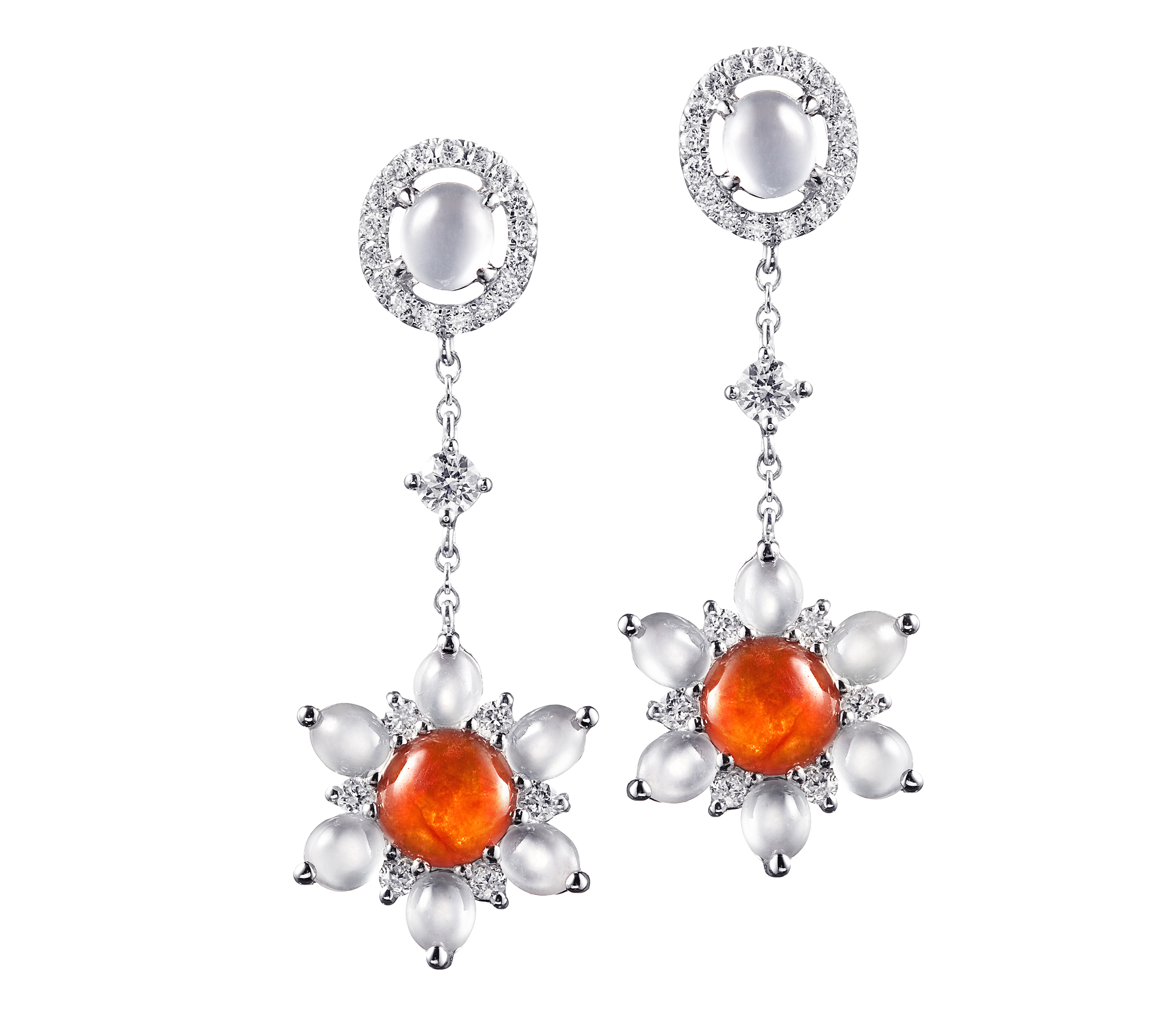 耶誕紅翡珠寶系列,設計有耳環、戒指與胸墜等款式。紅翡耳環,以嬌透紅豔的翡翠為主角,周圍嵌以白翡與鑽石,純淨與璀璨,宛如雪花澄澈,墜身比例適切,搖搖盪盪著浪漫與驚豔,紅與白的對比,別有視覺的立體層次之美;蛋面紅翡戒指,質色勻潤鮮麗,輔以燦亮的鑽飾,兩側點襯以白翡,交叉的設計線條,甚有舞動感,既華貴大器,又透著靈動的俏麗;紅翡墜飾,同樣以經典的蛋面造型,詮釋出如女王氣勢的丰采,璀亮鑽石烘托於旁,簡練設計之間,定位出了派對中備受注目的「嬌」點所在。