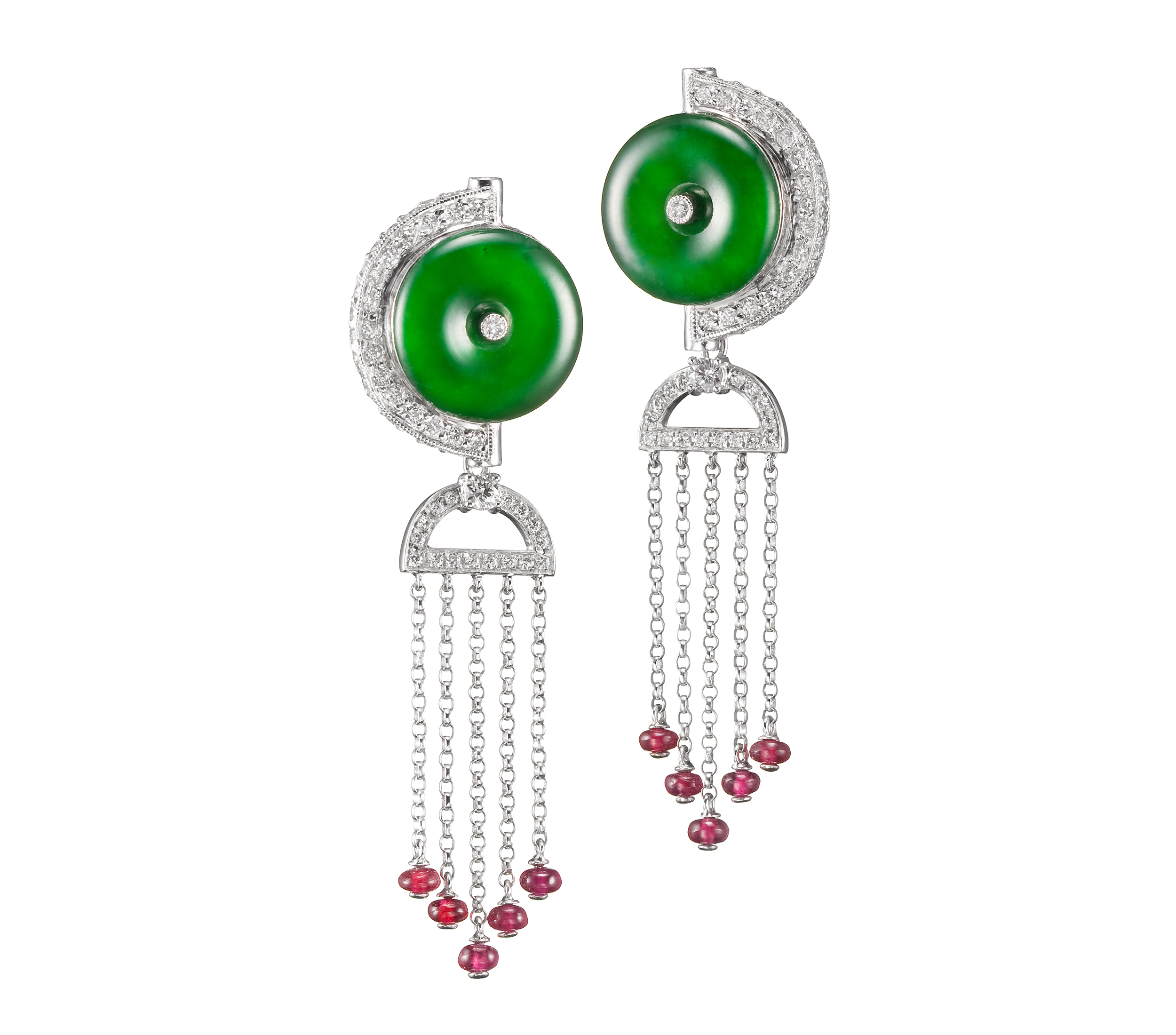 翡翠手鐲,自古以來便深蘊著愛情的圓滿與親情的傳承,是情感牽繫的最佳信物,既有護身庇佑之用,更能增添美麗光采,賞心悅目之際,燦然美事,亦同時圓滿完足。此款玉鐲,質地溫潤水透,翠色的流轉變化,透散著令人著迷的美,尤能表現女性的溫婉氣質和內涵品味。系列中的套鍊與耳環,皆以「古錢」為設計核心,這是承襲於玉文化傳統中的吉祥寓意。在玉文化的脈絡裡,玉和翡翠,不只是一個實體存在的物件,更是擔負著關於美好人生、幸福未來的期許,「古錢」的主題,即是寄寓著圓滿、財富與豐盈。古錢套鍊,將綠翠琢為古錢形,並搭配著小巧的橢圓形翡翠,兩相呼應,更具視覺美感和靈活度,鑽飾的線條,剛直簡練,恰與古錢的圓滿造型形成剛柔對比之美,鍊身則串以珍珠,串出了婉約柔美的風情;古錢耳環,則嵌以幾何式的鑽飾勾勒,銜接以流蘇,並裝飾著璀亮的紅寶石,既東方古典,又西方時尚,兼容展現了女人的聰慧靈動。