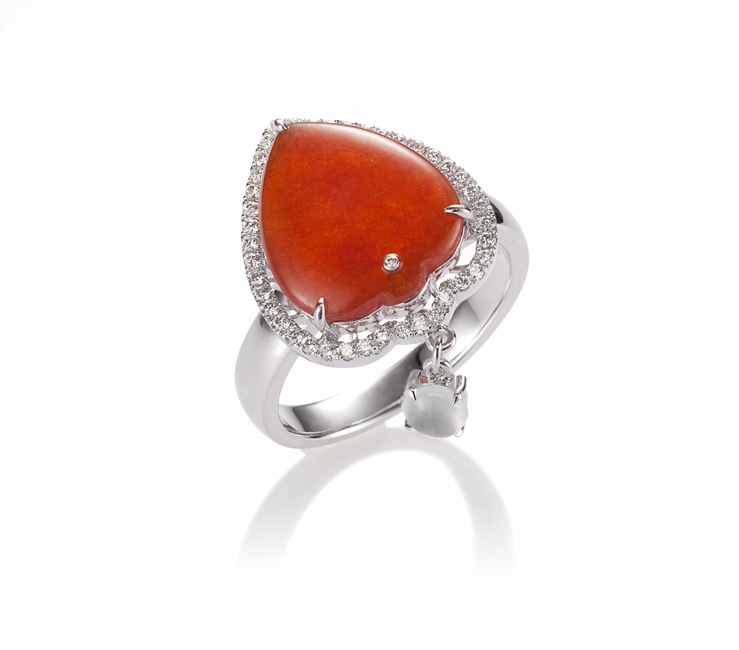 將紅翡翡翠琢為心形,象徵全心的愛戀,冰種白翡,點襯於旁,註解著純粹之美,搭配璀璨鑽飾,設計為墜飾與戒指,於是,心口與指間處,時時可以感受著愛的暖熱。另有一款蛋面冰種白翡鑲鑽耳環,蛋面翡翠,純潔似雪,耳畔處,彷彿聽見了雪落下的聲音,而唯有靜靜的傾聽,才能真正聽見對方的心聲。