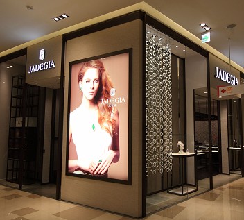 座落於板橋大遠百二期新館一樓的JADEGIA玉世家,佔地約30坪,整體風格承襲一貫大器優雅路線,並巧妙將東方人文精神融入西方美學設計,如以清代皇室收藏珍玩寶物的「多寶格」概念,打造出時尚簡約的櫥窗陳列空間,並將古代才德女子必備的「玉鐲」,化身為細膩雅致的現代裝置藝術-鐲圈垂簾,此外,兩幅由攝影大師蘇益良操刀拍攝的2015模特兒形象圖,無疑是捕捉目光的吸睛焦點,完美點亮JADEGIA玉世家品牌恢弘氣勢。古今中外並存的巧思與美感,處處用心營造可親近的低調奢華氛圍,使收藏家能悠然自在地於此鑑賞翡翠動人之美。