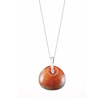 【相思甜心】系列,精選翡翠的美麗質色,有綠翠的深潤,紅翡的沉豔,以及紫羅蘭的浪漫,在不同翠色裡,自有個性,亦標幟出每段愛情故事迸擦出的不同火花。巧琢為相思豆的鍊墜,於凹面圈口處嵌飾了鑽石,在溫厚的柔潤裡,可見色彩的瑰美,也有鑽燦的光亮,而這枚具有厚度感又帶著視覺甜味的墜飾,就這樣負荷於心口,成為心上的依傍與滋潤,那是甜蜜的負荷,也是愛情美麗的重量。